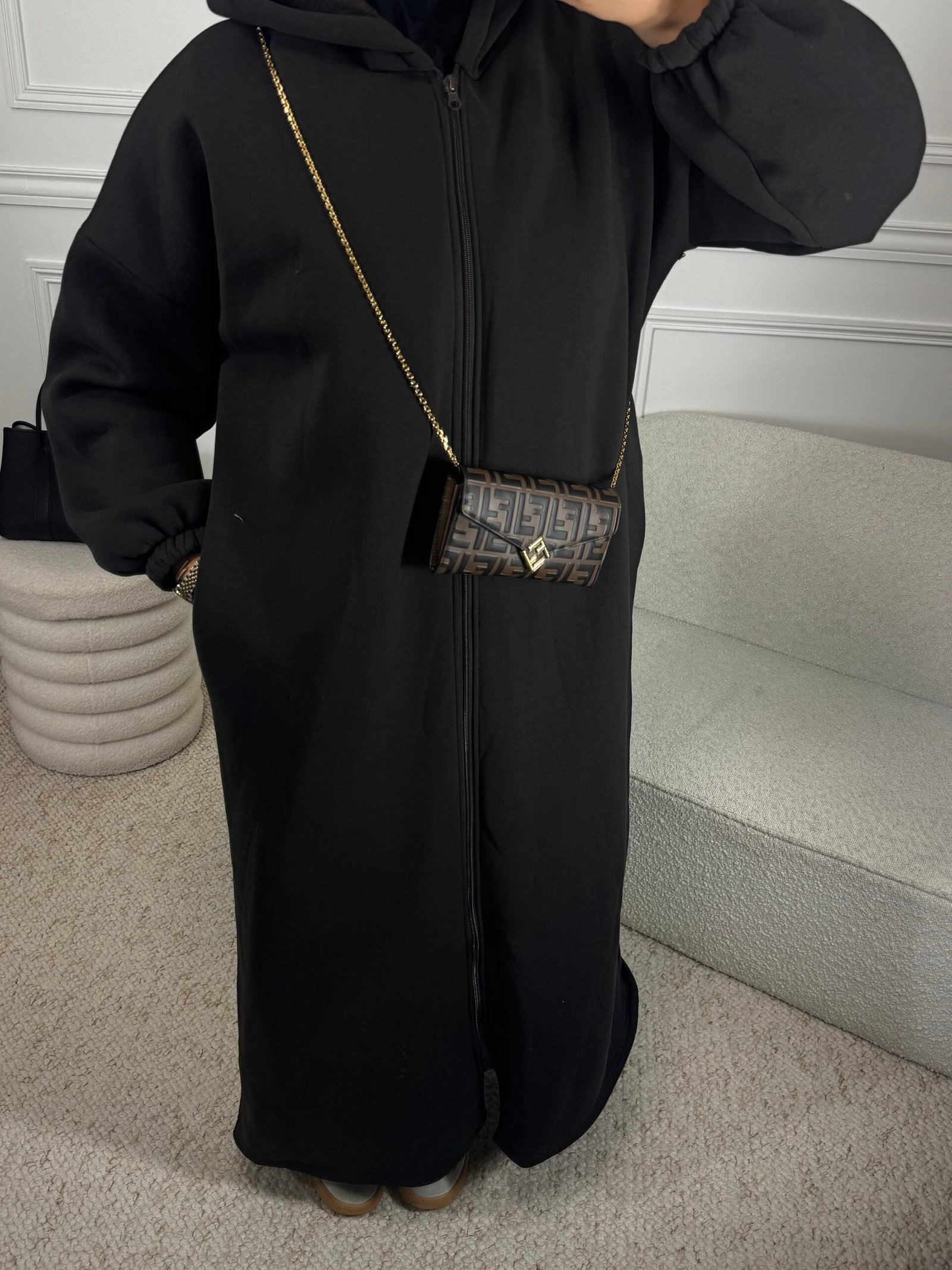 Une longue abaya qui se ferme par fermeture éclair, style gilet.