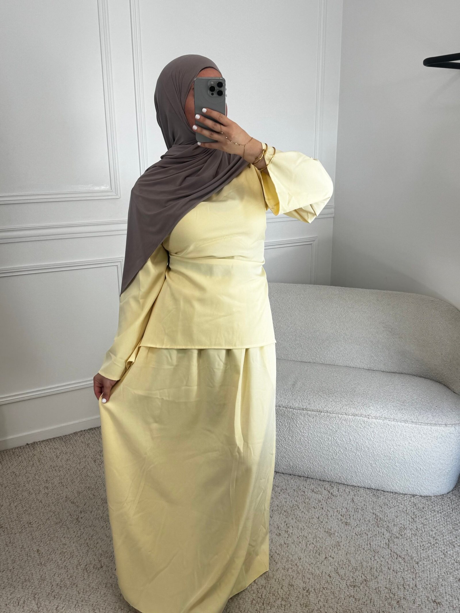 Cet ensemble tendance se compose d’un haut à manches longues, légèrement plus court à l’avant. Il se resserre à la taille grâce à des fils à nouer dans le dos, permettant d’ajuster l’effet cintré selon le style souhaité. Accompagné de sa jupe assortie.
