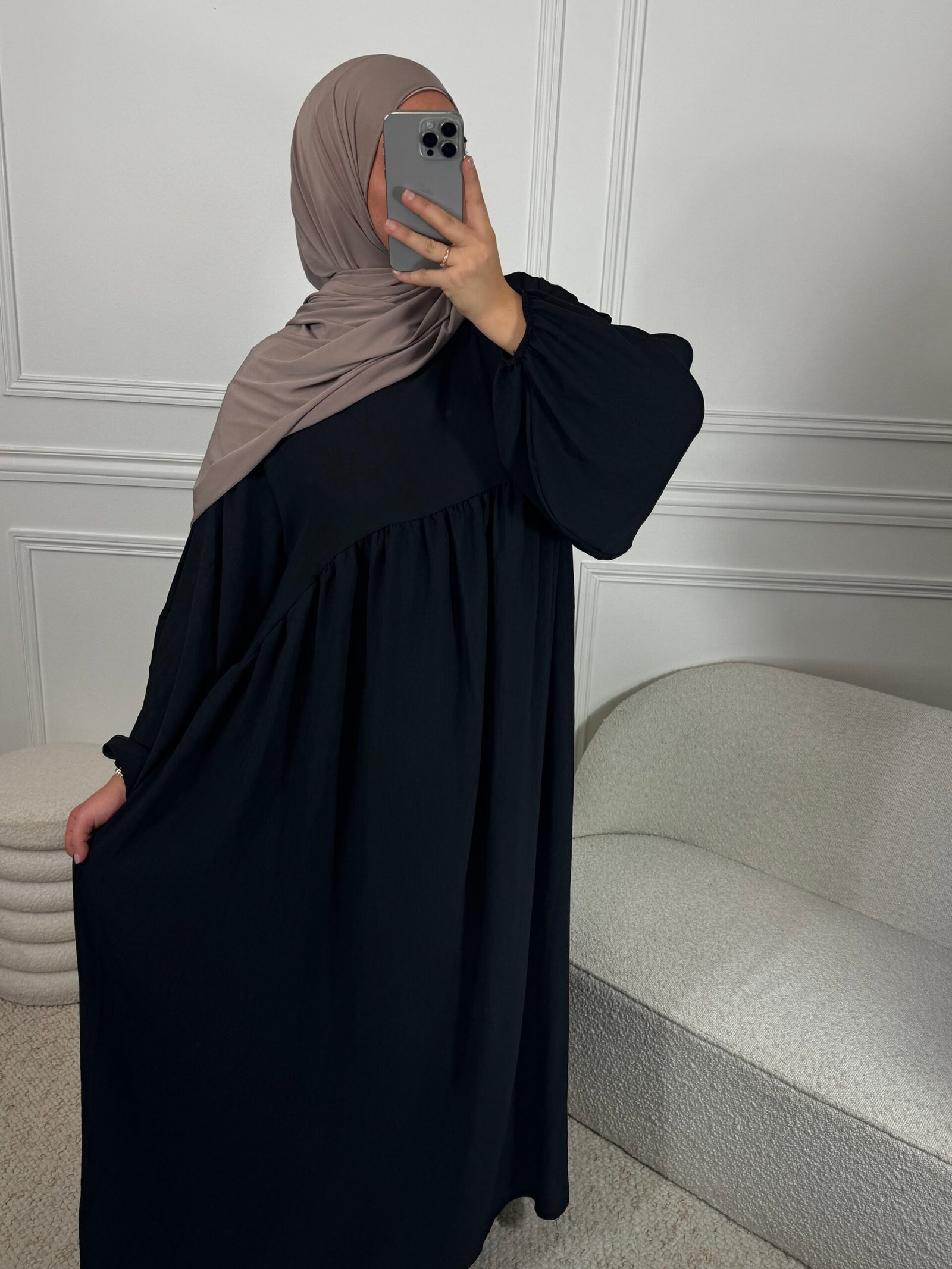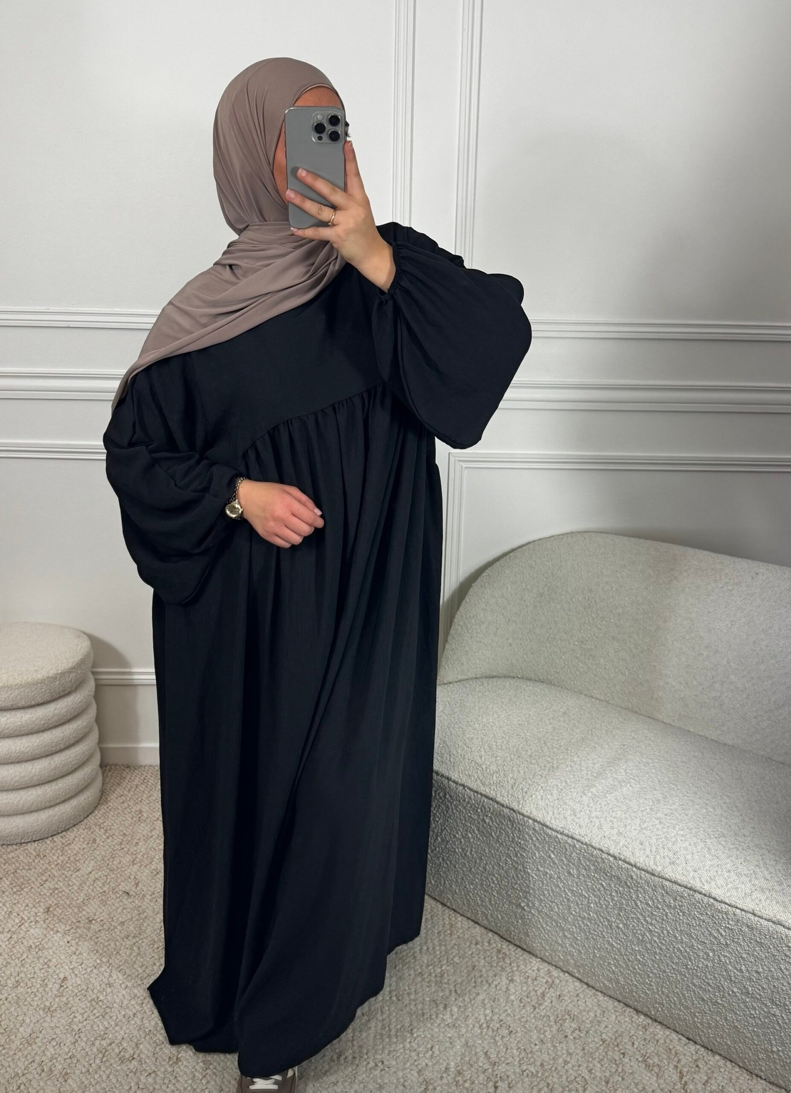 La abaya a manches ballon bouffantes offre un joli volume. Sa coupe fluide, en tissu Jazz, est idéale pour la saison, alliant confort et légèreté