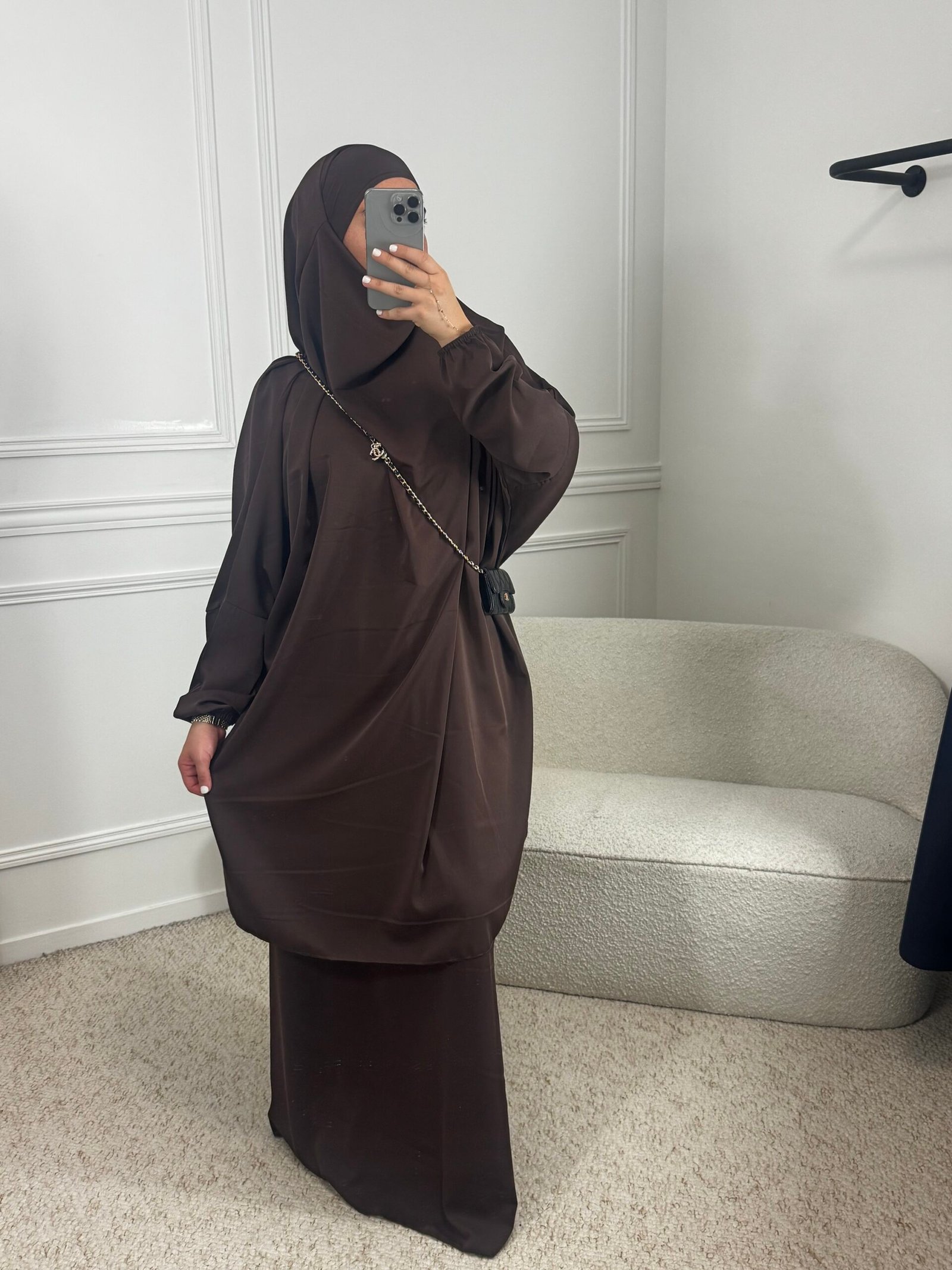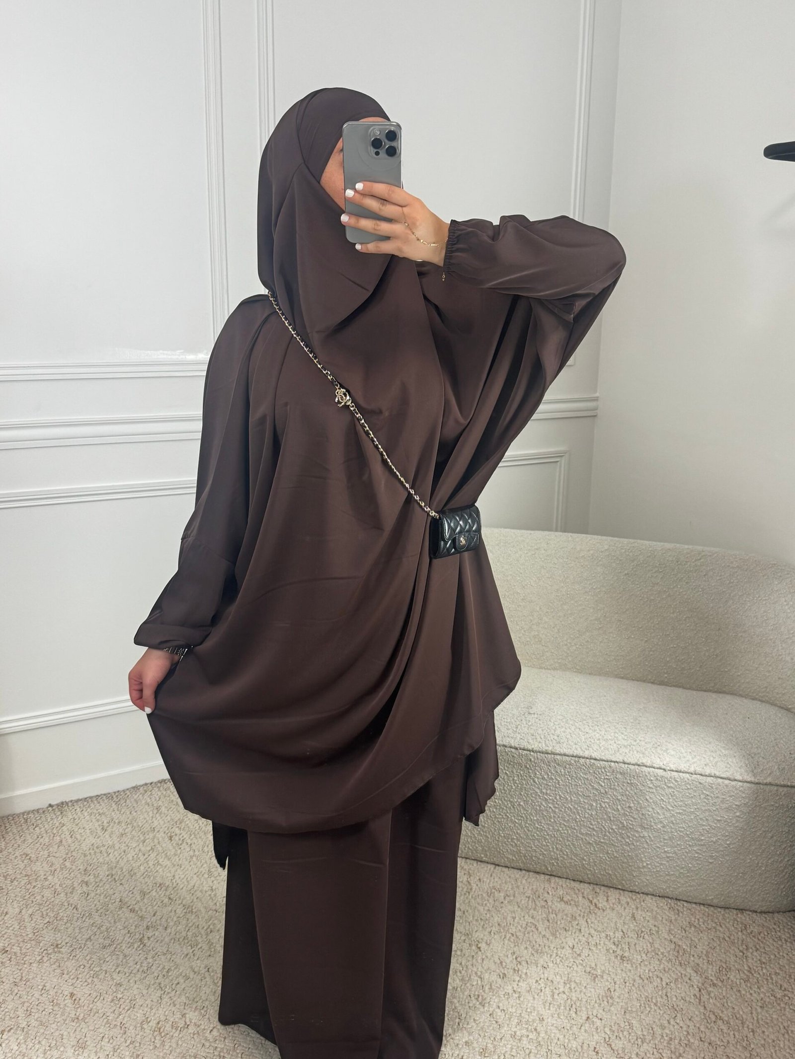 Ce jilbeb est fabriqué en soie de Médine, une matière douce et soignée, avec une coupe resserrée au poignet pour un style élégant.