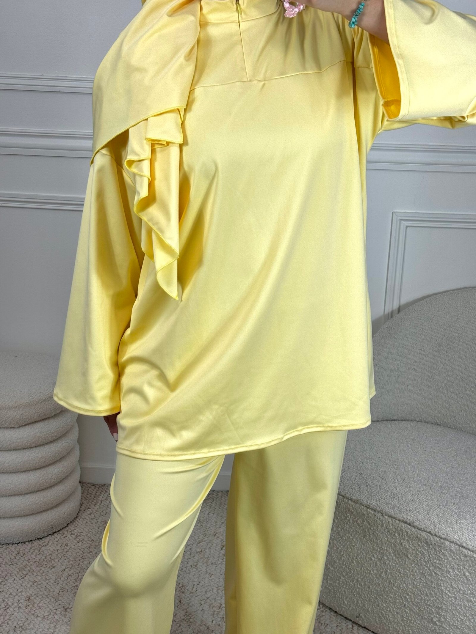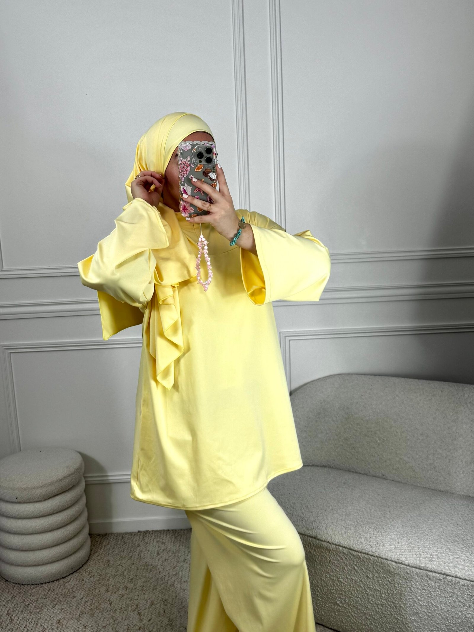 Ensemble de bain sobre et efficace, composé d’un pantalon et d’un haut à manches longues type T-shirt, dans une matière maillot de bain fluide, légère et agréable à porter.