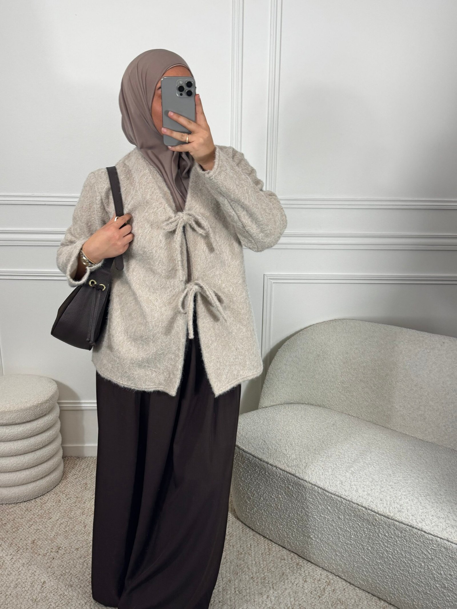 Il se ferme à l’aide de deux petits nœuds à l’avant, apportant une touche délicate et originale. Sa matière chaleureuse le rend parfait pour la saison, tout en restant léger et confortable.