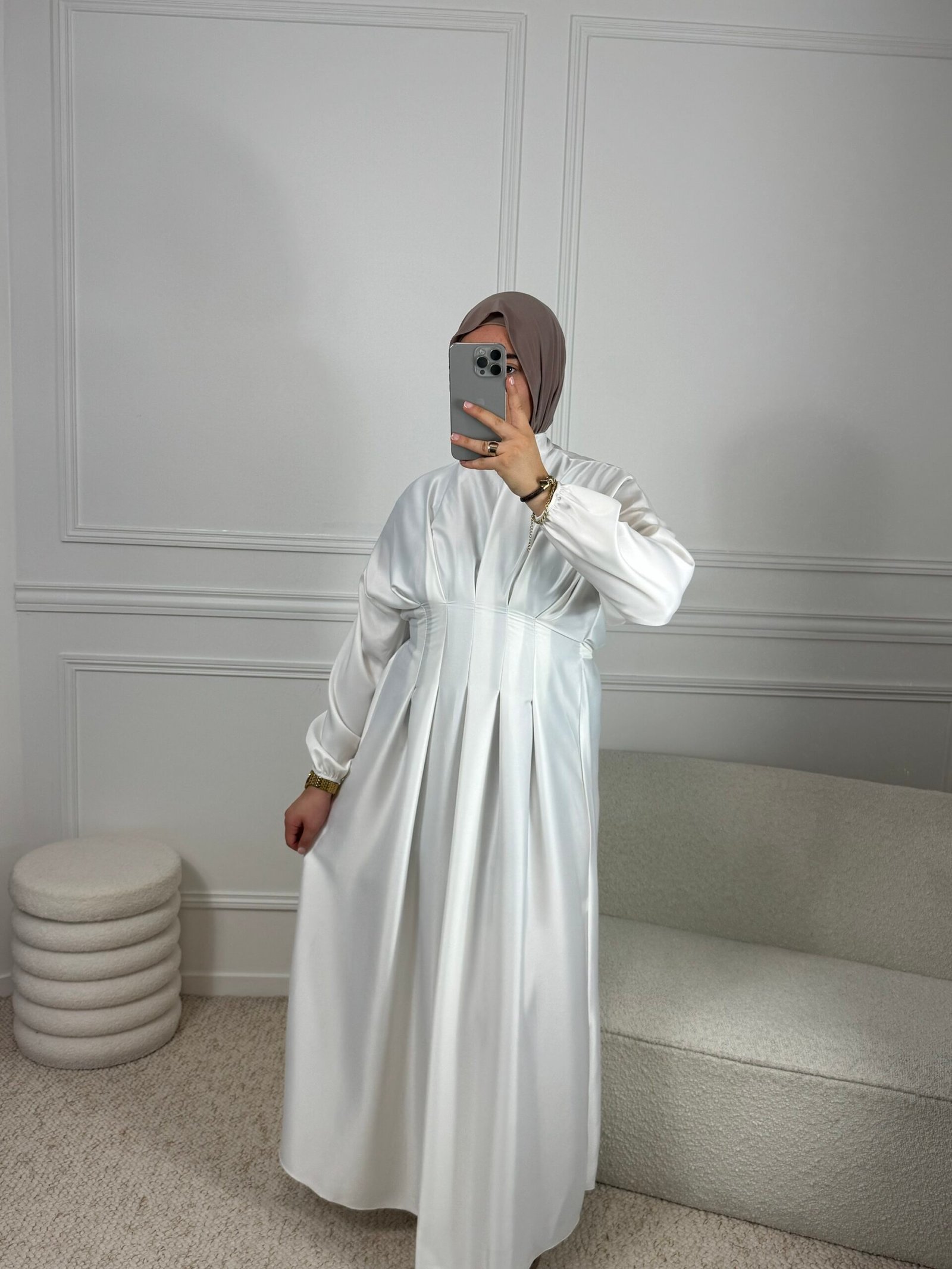 Une robe sophistiquée qui se distingue par ses manches légèrement bouffantes et son joli col. Elle se noue à l’arrière pour un ajustement parfait. Au centre, des détails délicats créent un effet corset qui structure la silhouette avec élégance. Un choix idéal pour l’Aïd et toutes les occasions spéciales.