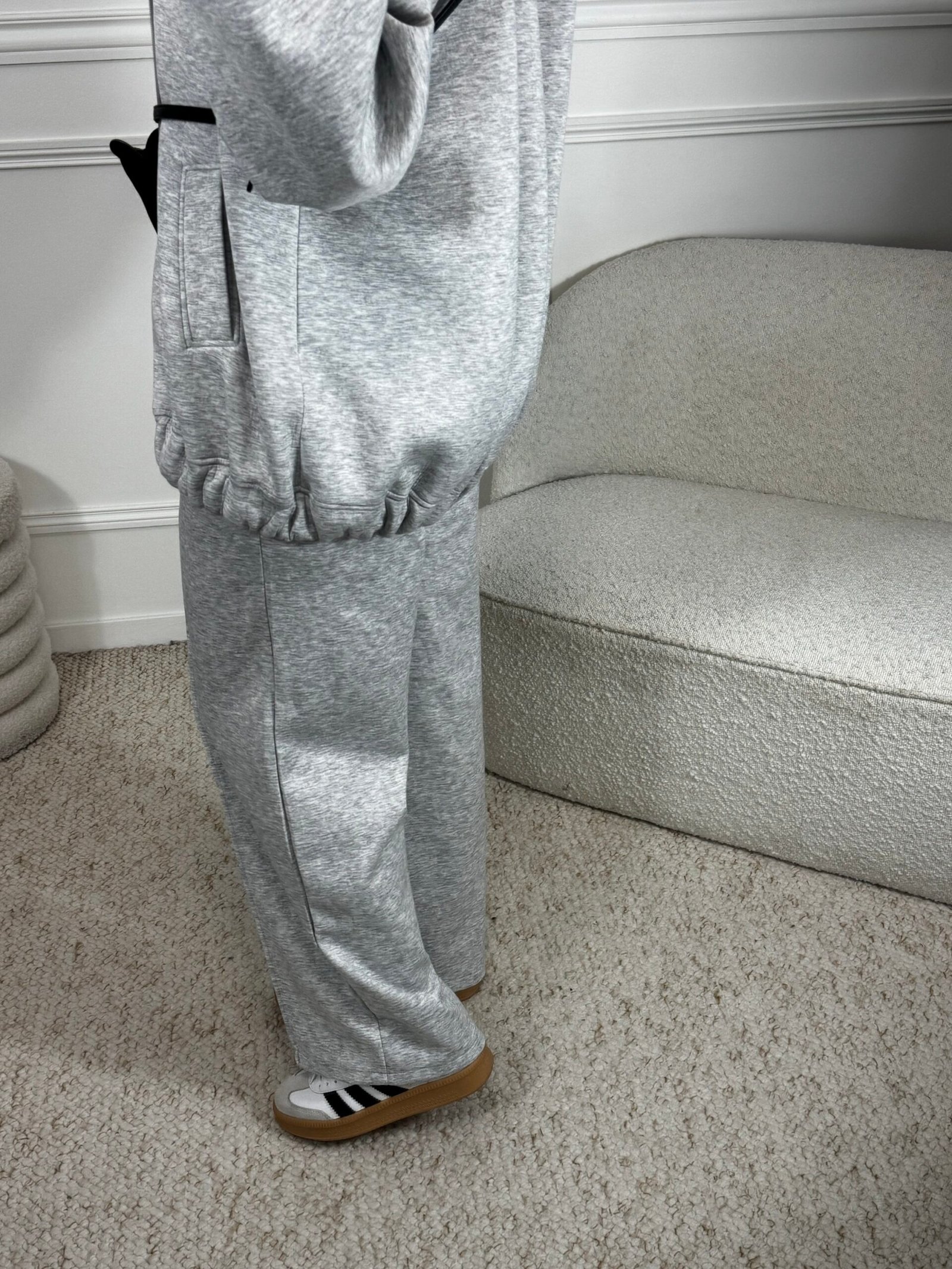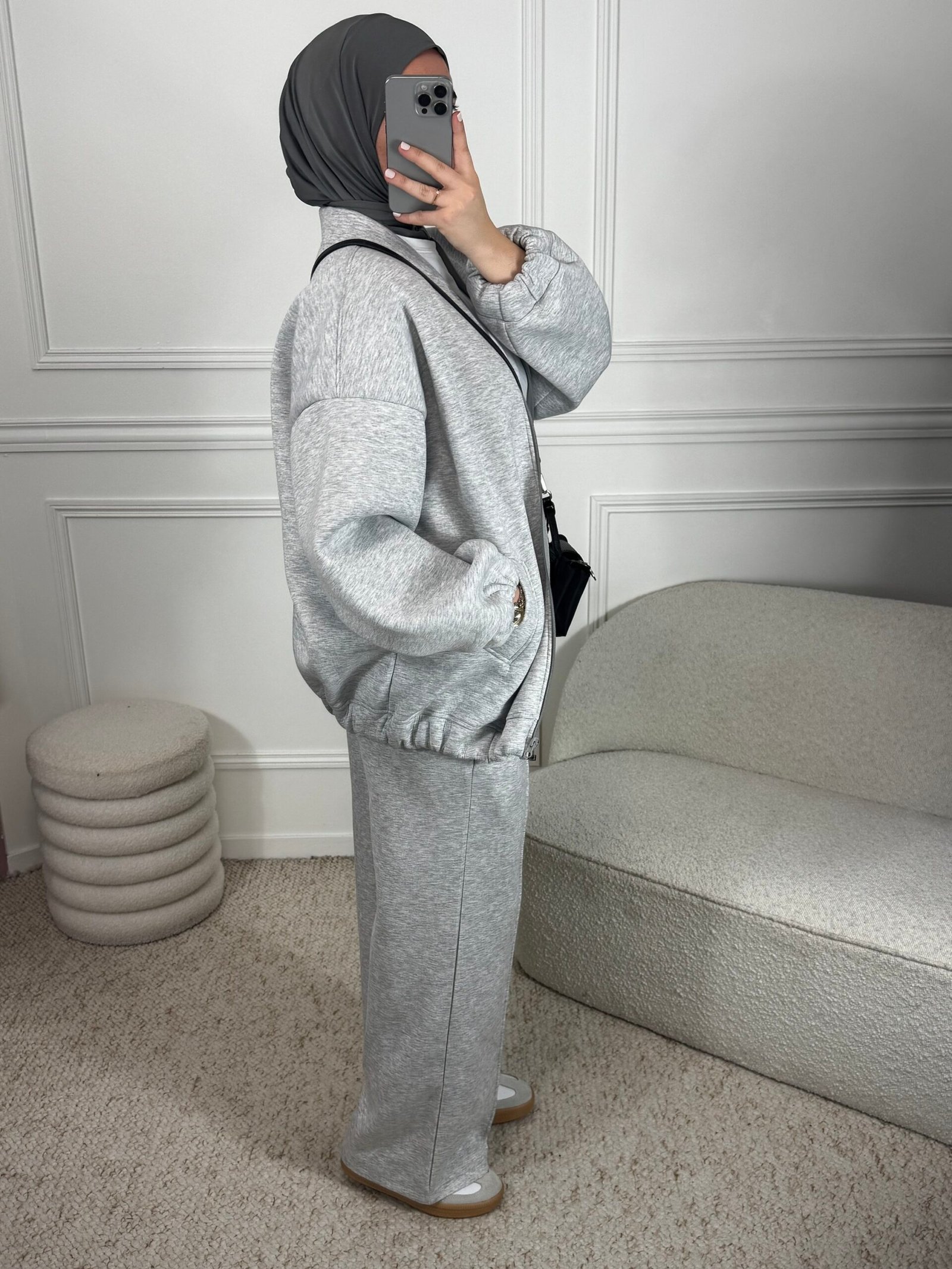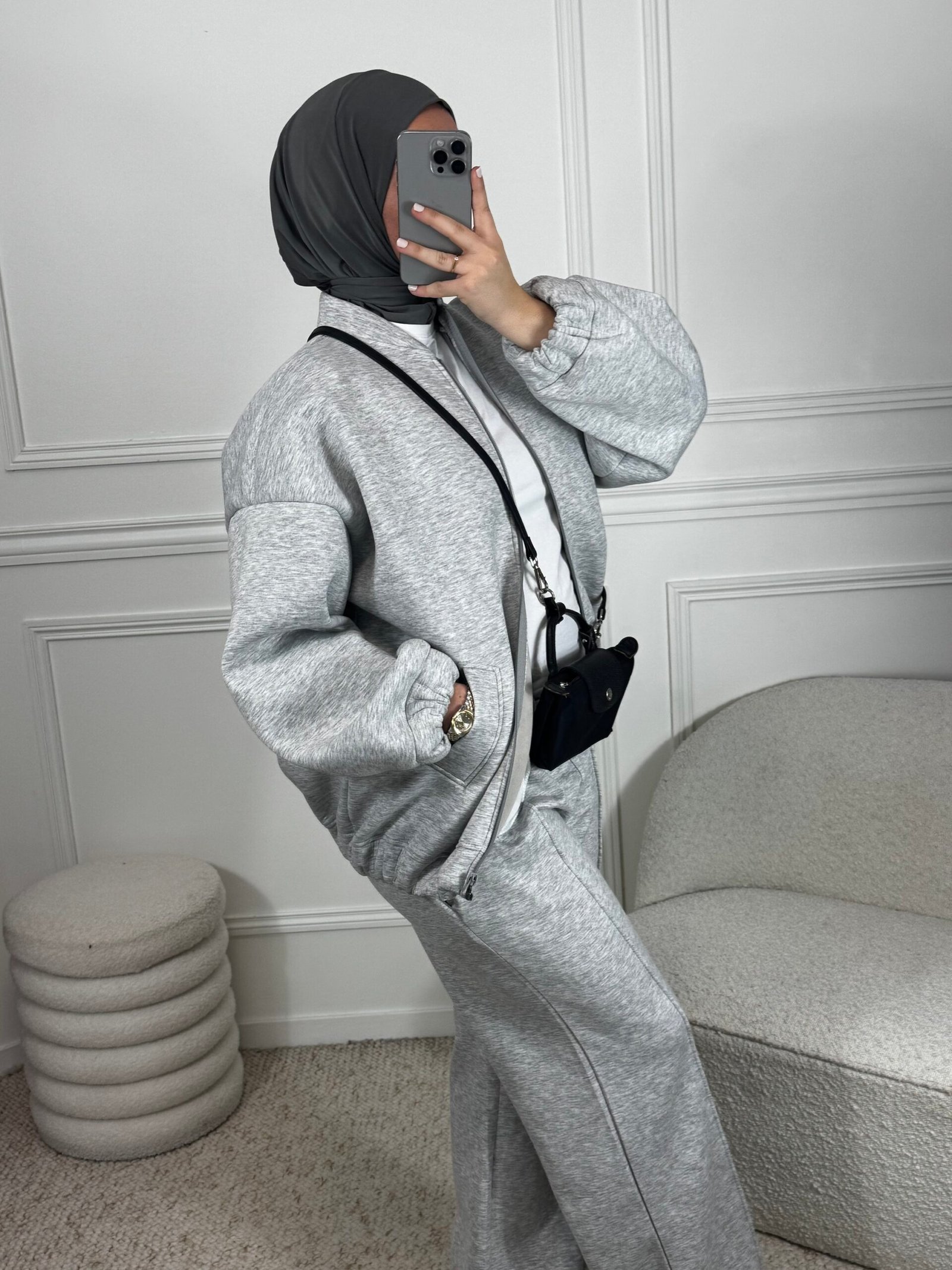Le pantalon offre une coupe agréable avec des poches pratiques, tandis que le gilet style bombers apporte une touche streetwear, légèrement resserré en bas, il crée un bel effet structuré et sa fermeture zippée renforce son côté pratique.